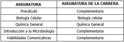 💡 Si ingresas a Microbiología de la Javeriana, las asignaturas del Preuniversitario que hayas aprobado harán parte de tu plan de estudios según la siguiente tabla.